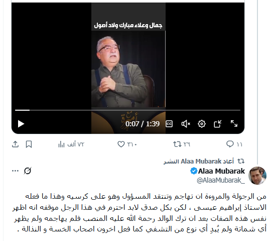 وتابع علاء مبارك رسالته لإيراهيم عيسى قائلًا: "لكن بكل صدق لابد أن أحترم في هذا الرجل موقفه أنه أظهر نفس هذه الصفات بعد أن ترك الوالد رحمة الله عليه المنصب، فلم يهاجمه ولم يظهر أي شماتة ولم يُبدِ أي نوع من التشفي كما فعل آخرون… ".