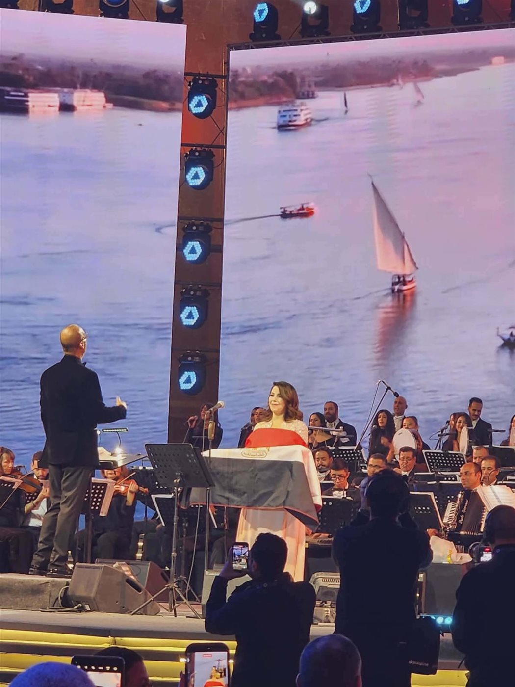 وحرصت الفنانة اللبنانية الكبيرة على غناء أغنية العندليب عبد الحليم حافظ «أحلف بسماها وبترابها» وهي متلفحة بالعلم المصري.