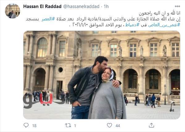 وكتب حسن عبر حسابه الشخصي بموقع التواصل الاجتماعي "فيس بوك" تدوينة قال فيها: "توفيت إلى رحمة الله تعالى أحن وأطيب أم في الدنيا السيدة فادية الرداد".