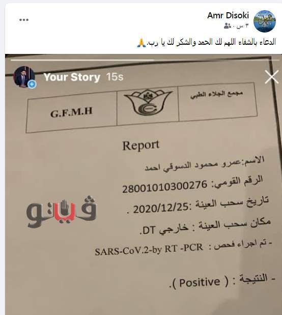 ونشر عمرو الدسوقي عبر صفحته الرسمية بموقع التواصل الاجتماعي فيس بوك نتيجة العينة الإيجابية للتحليل الخاص به بفيروس كورونا.