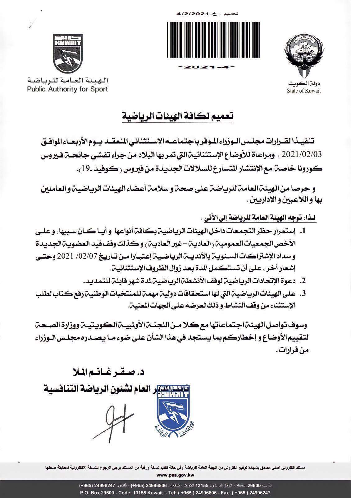 وكان فبراير العام الماضي شهد إيقاف النشاط الرياضي في الكويت والذي استمر حتى أغسطس بسبب جائحة الفيروس المستجد.