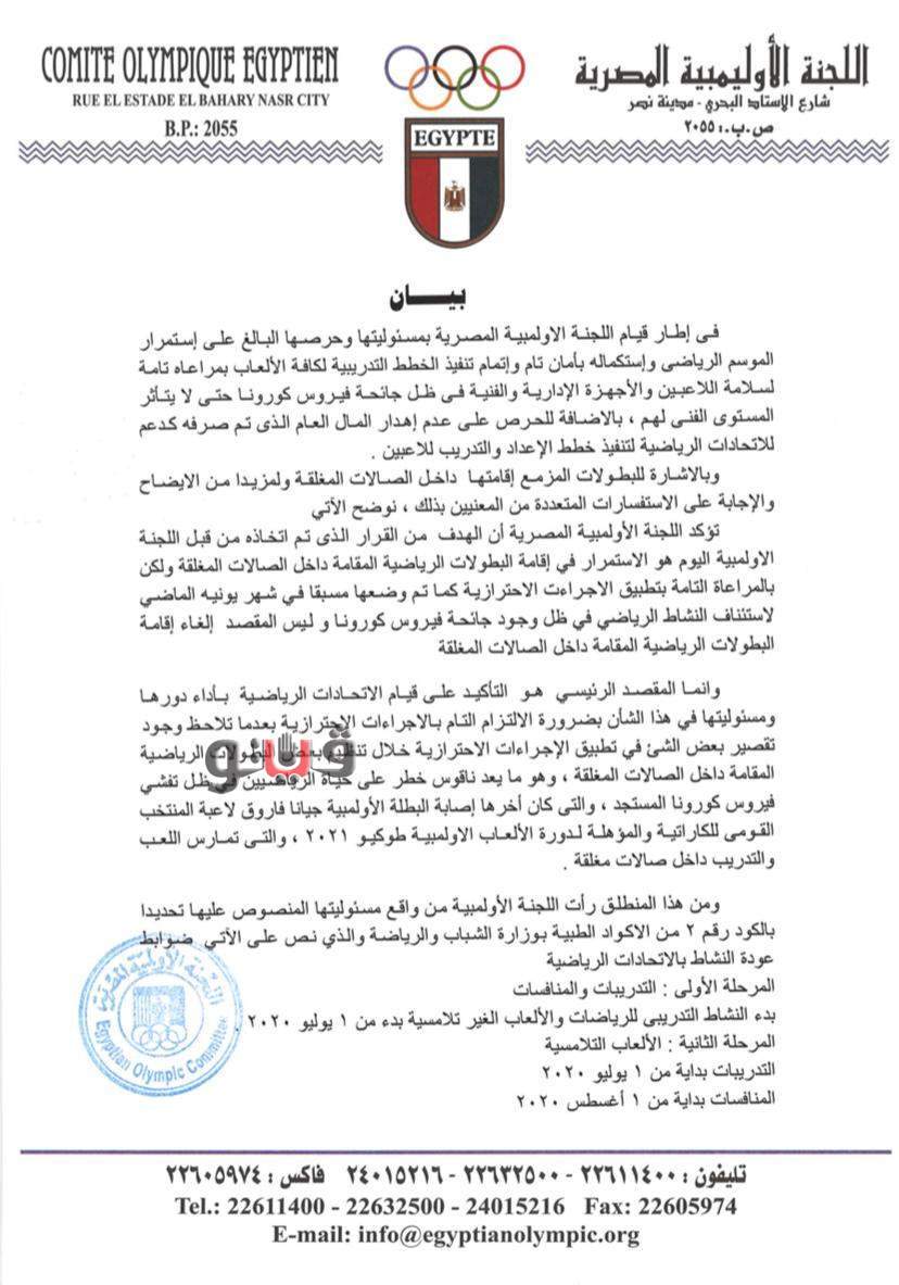 تؤكد اللجنة الأولمبية المصرية أن الهدف من القرار الذى تم اتخاذه من قبل اللجنة الاولمبية اليوم هو الاستمرار في إقامة البطولات الرياضية المقامة داخل الصالات المغلقة ولكن بالمراعاة التامة بتطبيق الاجراءت الاحترازية كما تم وضعها مسبقا في شهر يونيه الماضي لاستئناف النشاط الرياضي في ظل وجود جائحة فيروس كورونا و ليس المقصد إلغاء إقامة البطولات الرياضية المقامة داخل الصالات المغلقة