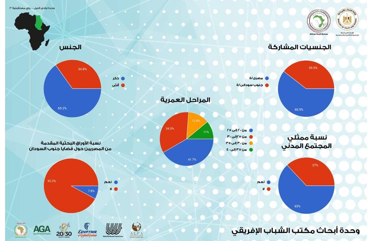 كما شكلت نسبة المتقدمين الجنوب سودانين حوالي 39.5% فيما بلغت نسبة المتقدمين من المصريين حوالي 60.5%،، يمثل هؤلاء الشباب فئات عديدة ومؤسسات مجتمع مدني بلغت نسبة الذين يمثلونها حوالي 63% من إجمالي عدد المتقدمين لحضور المؤتمر فيما مثلت 37% الباقية مشاركات فردية لا ينتمون لأي كيانات، وحوالي 7% فقط من إجمالي عدد من المتقدمين كانت لهم مشاركات بحثية مسبقة حول عدد من قضايا جنوب السودان والعلاقات الثنائية بين البلدين.