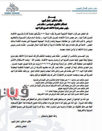 وأكد أن هذا القرار شابه العديد من المخالفات والتعدي على رغبة الجمعية العمومية التى اختارت مجلس نصر، بجانب عدم وجود أي مخالفات مالية أو إدارية تستدعي حل مجلسه.