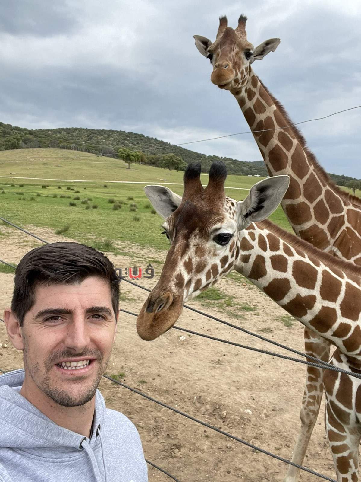 سخر البلجيكي تيبو كورتوا، حارس ريال مدريد، من طوله، بنشر صورة مع زرافتين داخل حديقة حيوانات في العاصمة الإسبانية مدريد.