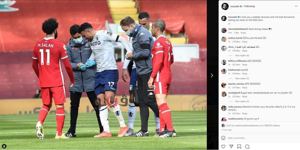 ونشر محمد صلاح عبر حسابه على إنستغرام صورة للحظة إصابة تريزيجيه وعلق عليها قائلا: "أتمنى لك سرعة الشفاء وأتطلع لرؤيتك سريعا بالملاعب".