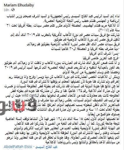 وكانت مريم الهضيبي أطلقت هي الأخرى استغاثة للرئيس عبد الفتاح السيسي والدكتور أشرف صبحى وزير الشباب الرياضة والمهندس هشام حطب رئيس اللجنة الأولمبية المصرية.