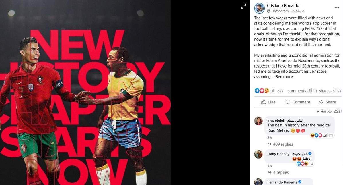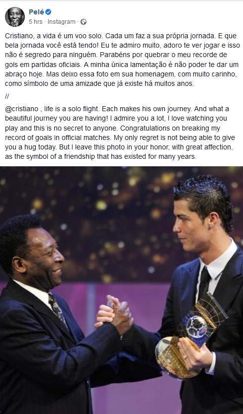 ومن جانبه علق بيليه على بيان رونالدو وقال على صفحته الرسمية في موقع "فيسبوك": "الحياة رحلة منفردة، كل واحد يقوم برحلته
