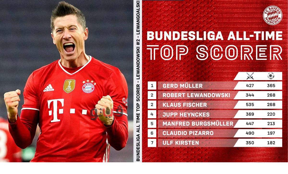 وذكرت شبكة "أوبتا" للإحصائيات أن ليفاندوفسكي وصل إلى 268 هدفًا في البوندسليجا، ليصبح ثاني الهدافين التاريخيين للبطولة.