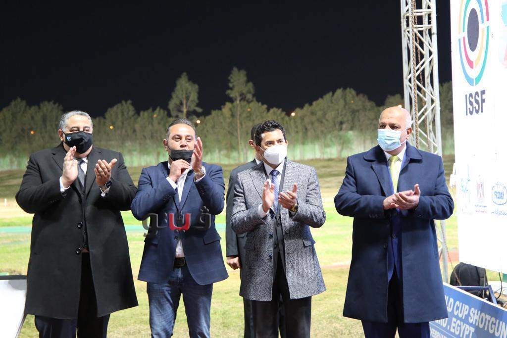 شاهد الوزير نهائي منافسات التراب في ختام البطولة التي تحتضنها مصر ، بمشاركة 32 دولة، وقدم الوزير ورئيس الاتحاد المصري للرماية، جوائز المراكز الثلاثة الأولى إلى الفائزين في مسابقات الفرق "تراب" (رجال وسيدات).