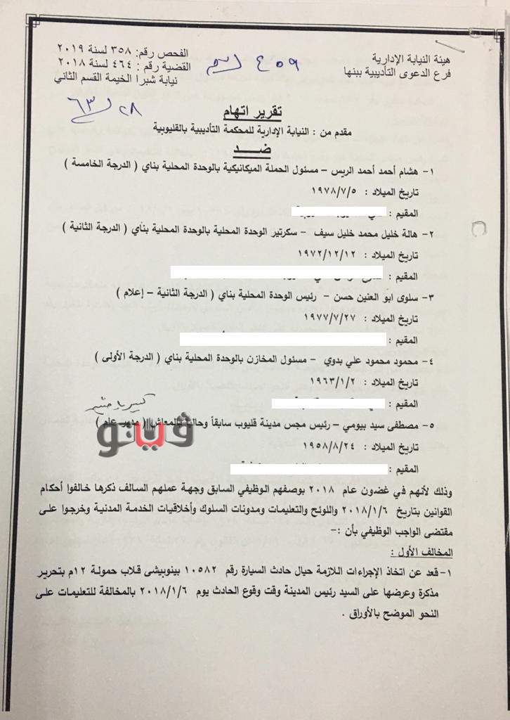وكشفت التحقيقات أن هشام أحمد الريس، مسئول الحملة الميكانيكية بالوحدة المحلية بـ"ناي" التابعة لمجلس مدينة قليوب تقاعس عن إتخاذ الإجراءات اللازمة حيال حادث السيارة رقم 10582 قلاب حمولة 12 م بشأن تحرير مذكرة وعرضها على رئيس المدينة وقت وقوع الحادث بالمخالفة للتعليمات.