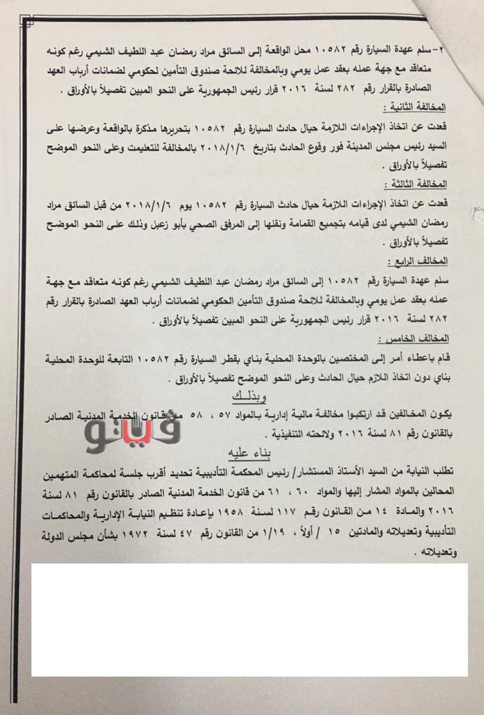 ولم تقم هالة خليل محمد، سكرتير الوحدة المحلية باتخاذ الإجراءات اللازمة حيال حادث السيارة حيث لم تحرر مذكرة بالواقعة وعرضها على رئيس مجلس المدينة فور وقوع الحادث وبالمخالفة للتعليمات.