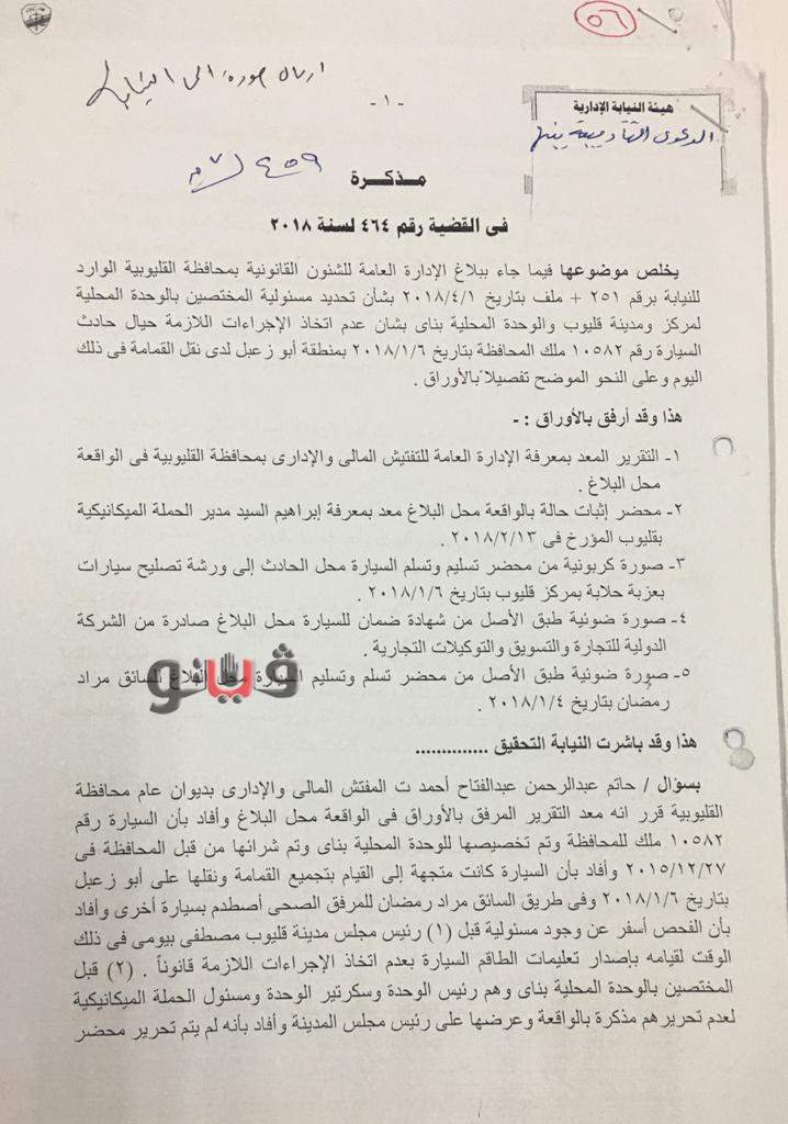 وكانت النيابة الإدارية تلقت بلاغًا من الإدارة العامة للشئون القانونية بمحافظة القليوبية لتحديد مسئولية المختصين بالوحدة المحلية لمركز ومدينة قليوب والوحدة المحلية بـ"ناي" بشأن عدم اتخاذ الإجراءات اللازمة حيال حادث السيارة ملك المحافظة أثناء نقل القمامة بمنطقة أبو زعبل.