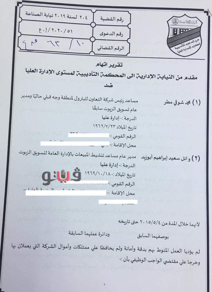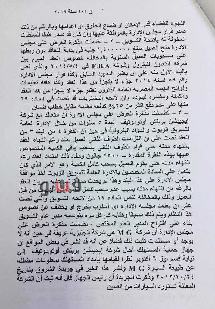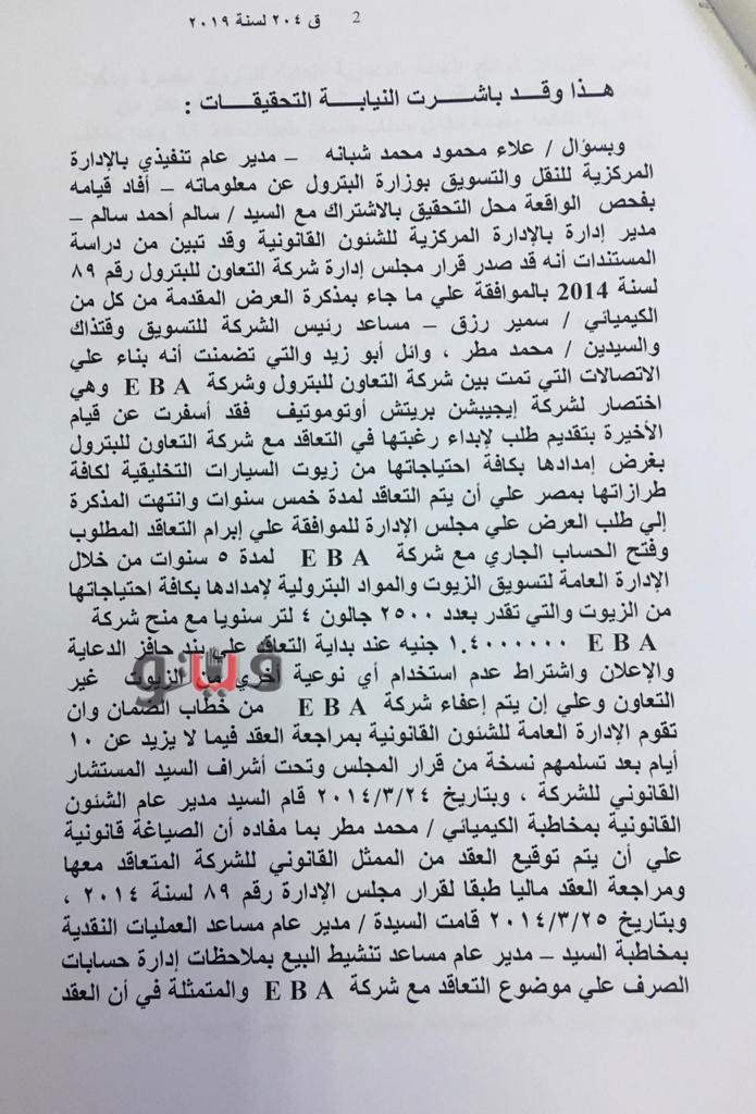 وجاء بأوراق القضية أن وائل سعيد إبراهيم، مدير عام مساعد تنشيط المبيعات بالإدارة العامة لتسويق الزيوت ويشغل درجة من مستوى "إدارة عليا" قام بفتح حساب لشركة "إيجيبشن بريتش أوتوموتيف" بمنطقة وجه قبلي البيعية بالمخالفة للقواعد المنظمة لذلك ودون موافقة مجلس الإدارة.