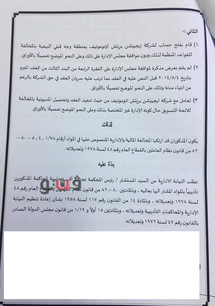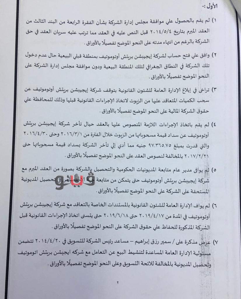 ولم يرسل للإدارة العامة للشئون القانونية المستندات الخاصة بالتعاقد مع شركة إيجيبشن بريتش أتوموتيف حتى يتسنى اتخاذ الإجراءات القانونية قبل الشركة المذكورة للحفاظ على حقوق الشركة، وعرض مذكرة على سمير رزق إبراهيم، مساعد رئيس الشركة للتسويق تتضمن مسئولية الإدارة العامة المساعدة لتنشيط البيع عن التعامل مع شركة ايجيبشن بريتش أتوموتيف وتحصيل المديونية بالمخالفة للائحة التسويق.
