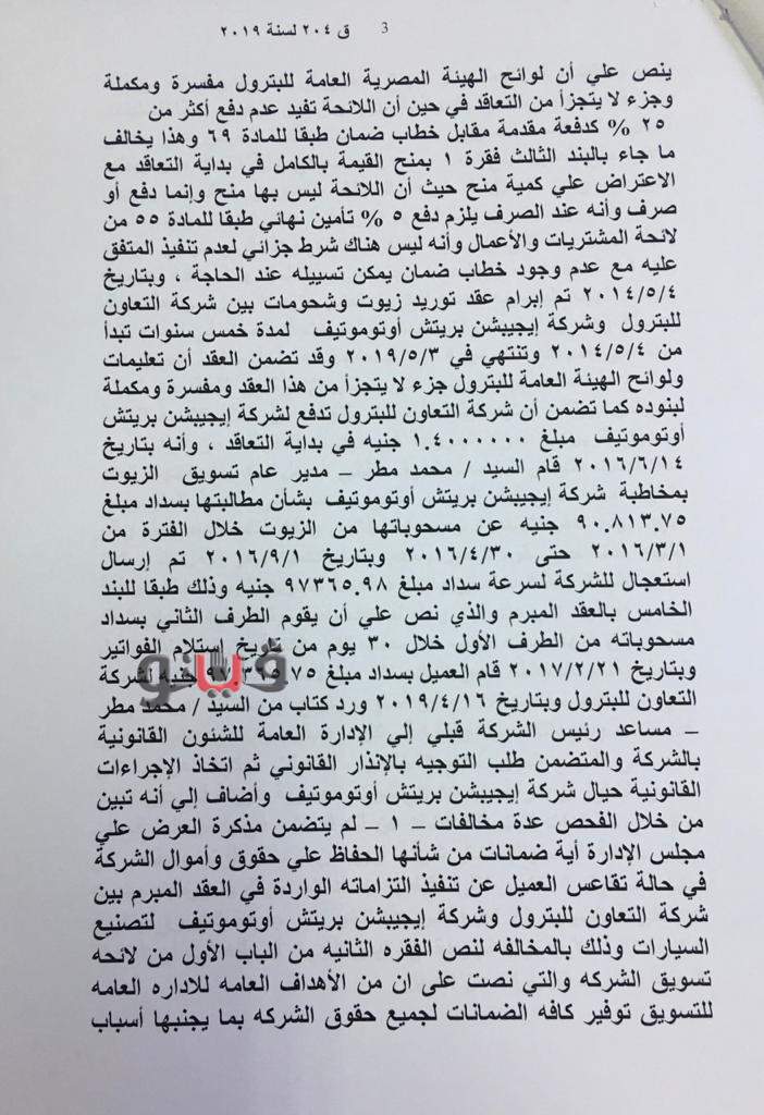 وكشفت التحقيقات أن محمد شوقي مطر، مساعد رئيس شركة التعاون للبترول ويشغل درجة من مستوى "إدارة عليا" لم يقم بالحصول على موافقة مجلس إدارة الشركة بشأن الفقرة الرابعة من البند الثالث من العقد المبرم قبل النص عليه فى العقد مما ترتب عليه سريان العقد فى حق الشركة رغم انتهاء مدته.