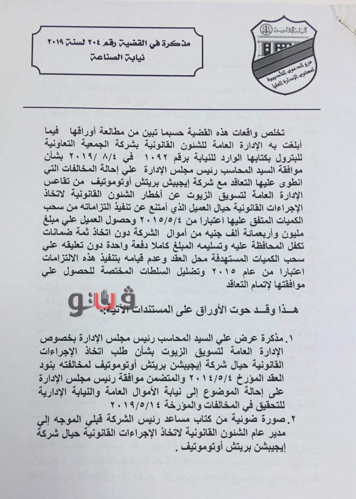 رصد تقرير قضائي صادر عن النيابة الإدارية قضية فساد مالي وإداري داخل شركة التعاون للبترول أحيل على إثرها مساعد رئيس الشركة ومدير عام تنشيط المبيعات وتسويق الزيوت للمحاكمة العاجلة بسبب مخالفات العقد المبرم مع شركة "إيجيبشن بريتش أوتوموتيف" دون موافقة مجلس الإدارة.