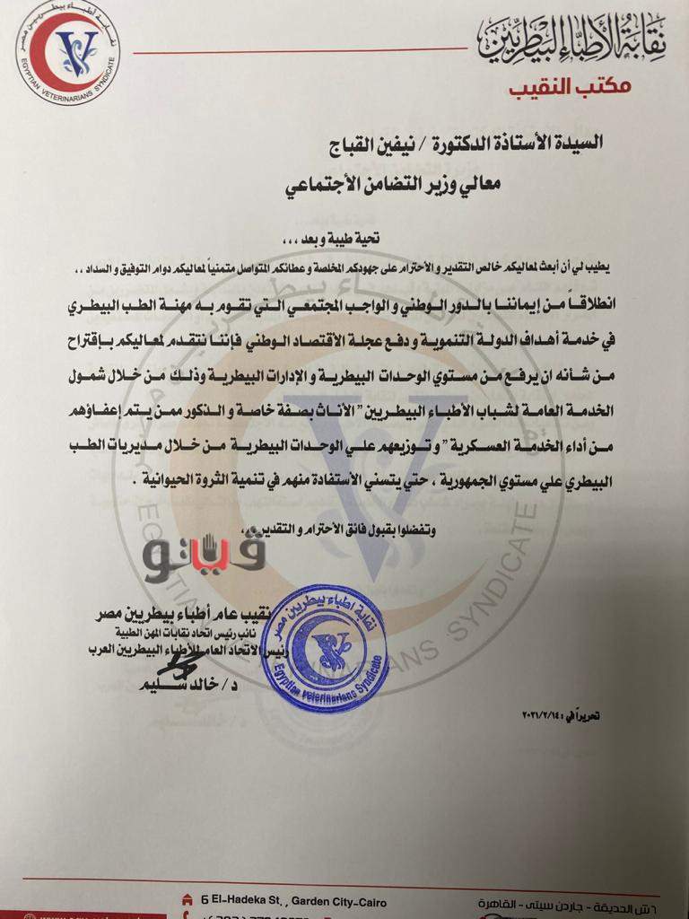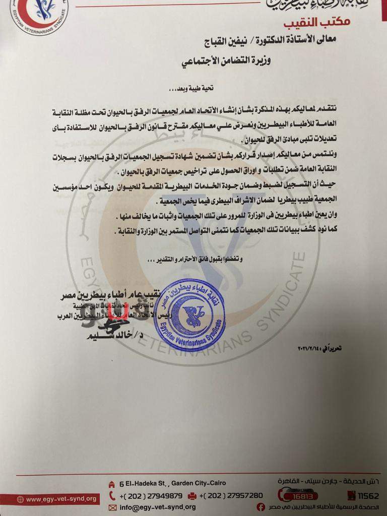 وكذلك إصدار قرار بتضمين شهادة تسجيل جمعيات الرفق بالحيوان بسجلات النقابة العامة ضمن متطلبات وأوراق الحصول على تراخبص جمعيات الرفق بالحيوان، وذلك لضبط وضمان جودة الخدمات البيطرية المقدمة للحيوان، وأن يكون أحد المؤسسين للجمعية طبيبا بيطريت لضمان الإشراف البيطرى فيما يخص الجمعية.