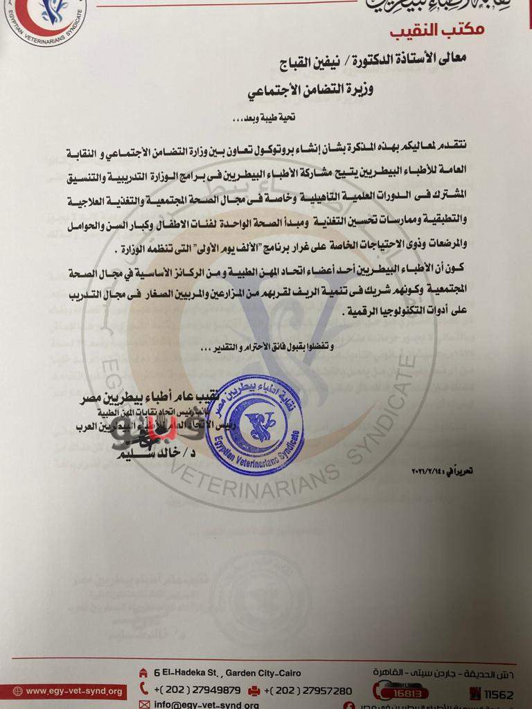 كما عرض النقيب العام على وزيرة التضامن مقترح قانون الرفق بالحيوان للاستفادة بأى تعديلات تحقق الهدف من وضع القانون، وطرح إنشاء الاتحاد العام لجمعيات الرفق بالحيوان تحت مظلة النقابة العامة للأطباء البيطريين.