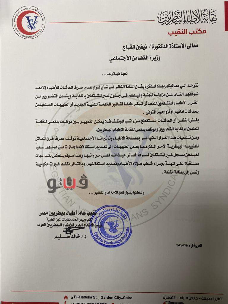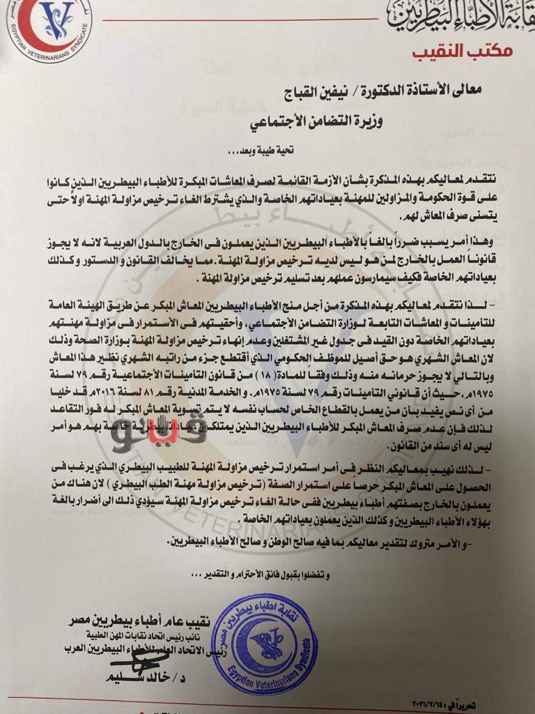 ولفت إلى أزمة صرف المعاشات المبكرة للأطباء البيطريين الذين كانوا على قوة الحكومة و المزاولين للمهنة بعياداتهم الخاصة، والذى يُشترط إلغاء ترخيص مزاولة المهنة أولا لصرف المعاش لهم، مؤكدا أن ذلك أضر بالبيطريين العاملين بالخارج بالدول العربية.