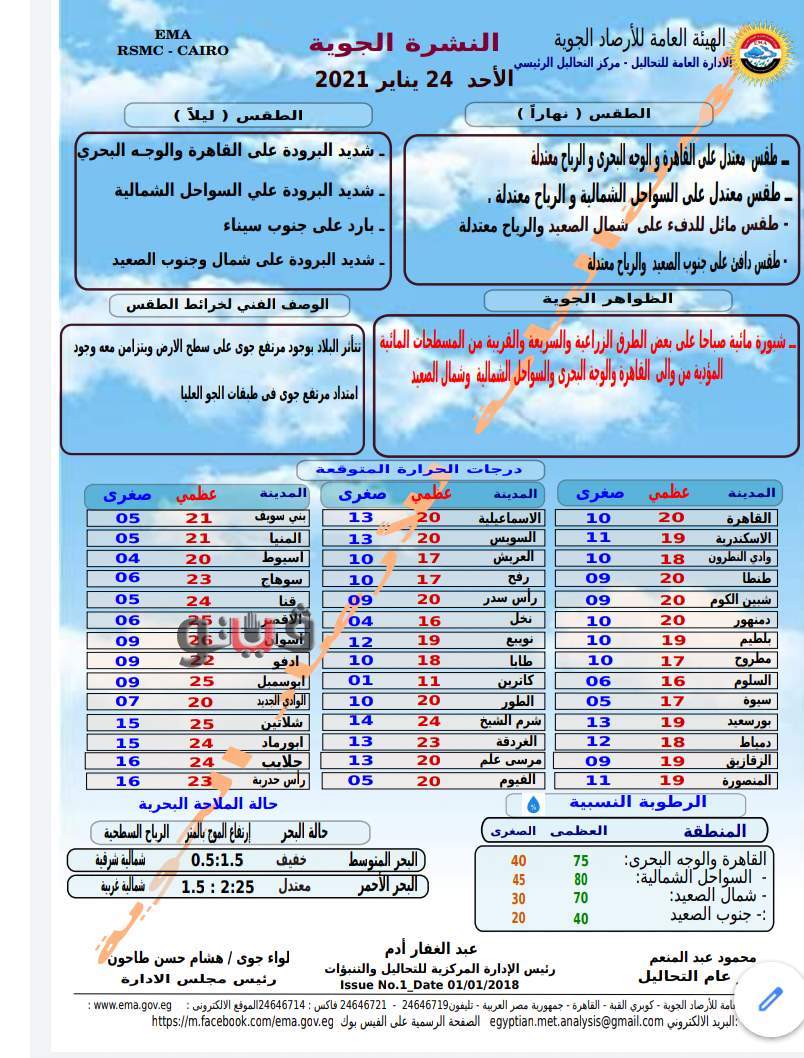 الأرصاد الجوية تعلن درجات الحرارة اليوم الأحد 24-1-2021 في مصر
