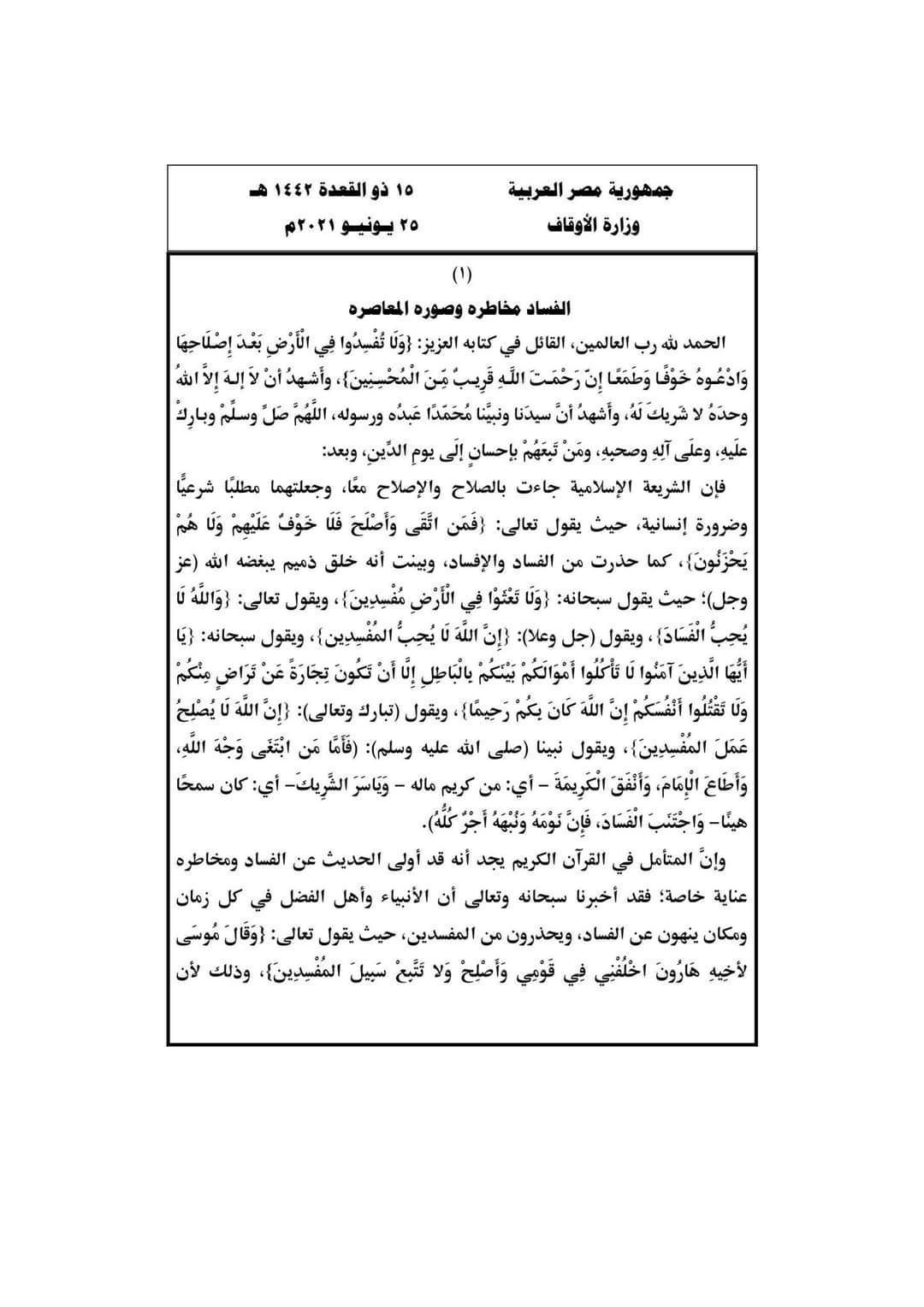 نشرت وزارة الأوقاف موضوع خطبة الجمعة المقبلة، تحت عنوان "الفساد مخاطره وصوره المعاصرة"، مع التأكيد على جميع الأئمة الالتزام بموضوع الخطبة نصا أو مضمونا على أقل تقدير.