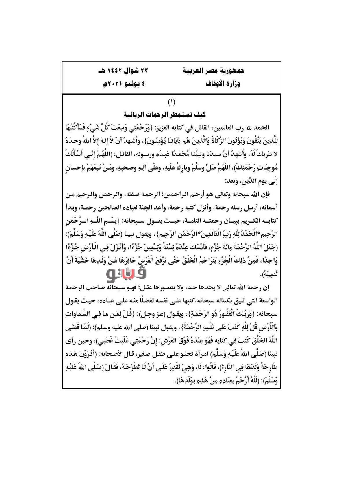 الأوقاف تنشر نص خطبة الجمعة المقبلة | صور