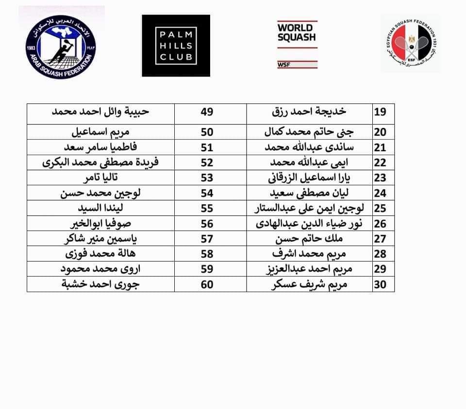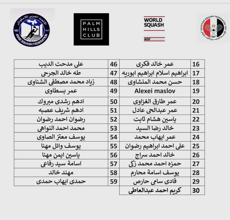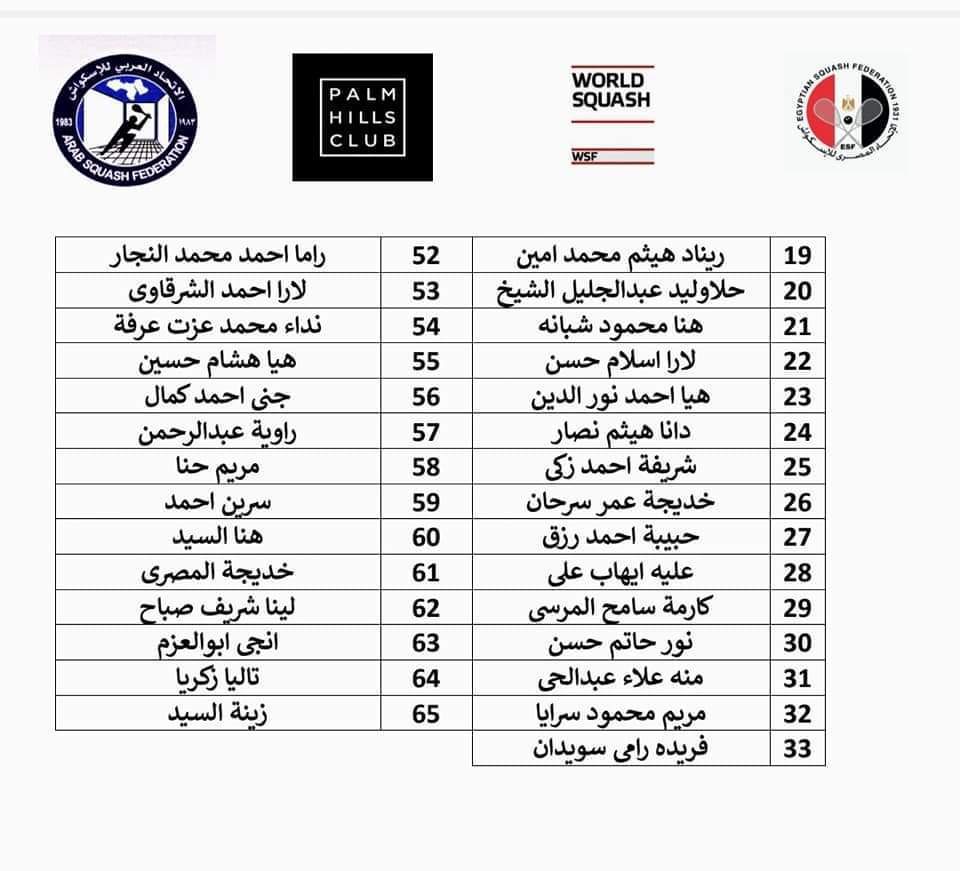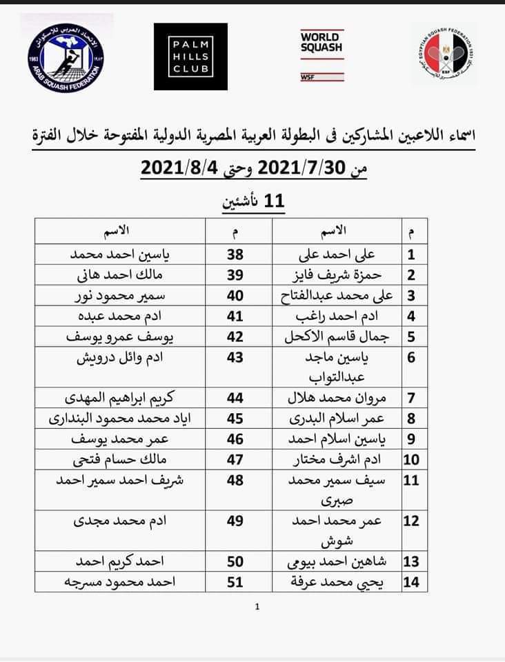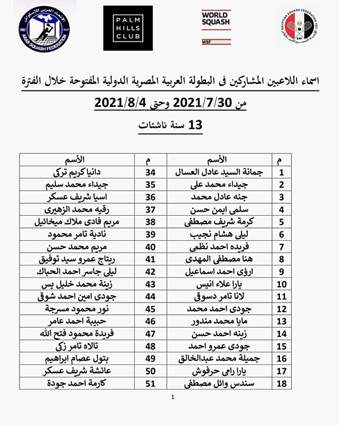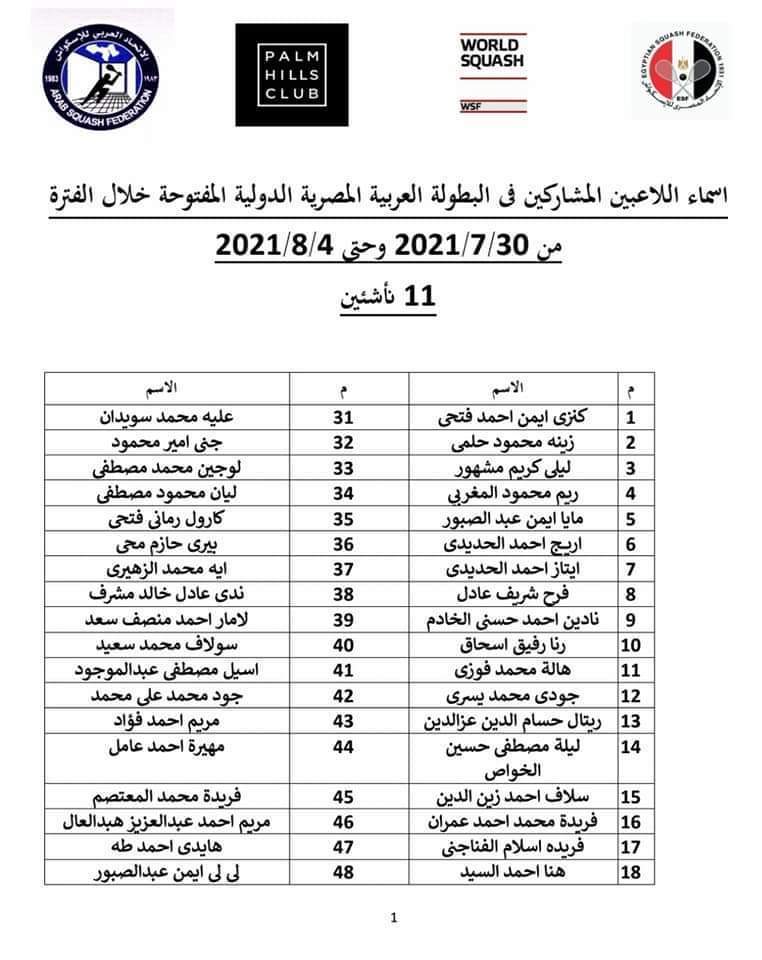 أسماء اللاعبين واللاعبات المشاركين في البطولة العربية المصرية الدولية المفتوحة "بالم