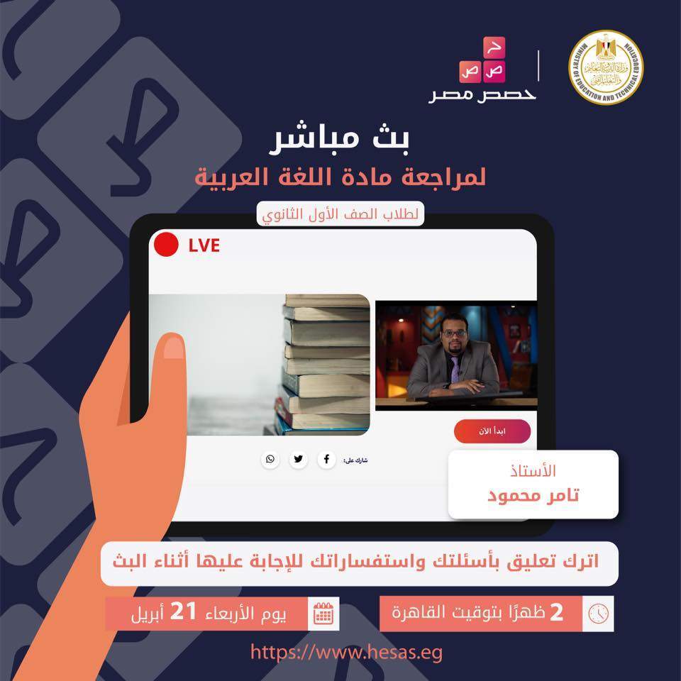 وجهت وزارة التربية والتعليم والتعليم الفني، رسالة لطلاب الصف الأول الثانوي بمتابعة البث المباشر لمراجعة مادة اللغة العربية.