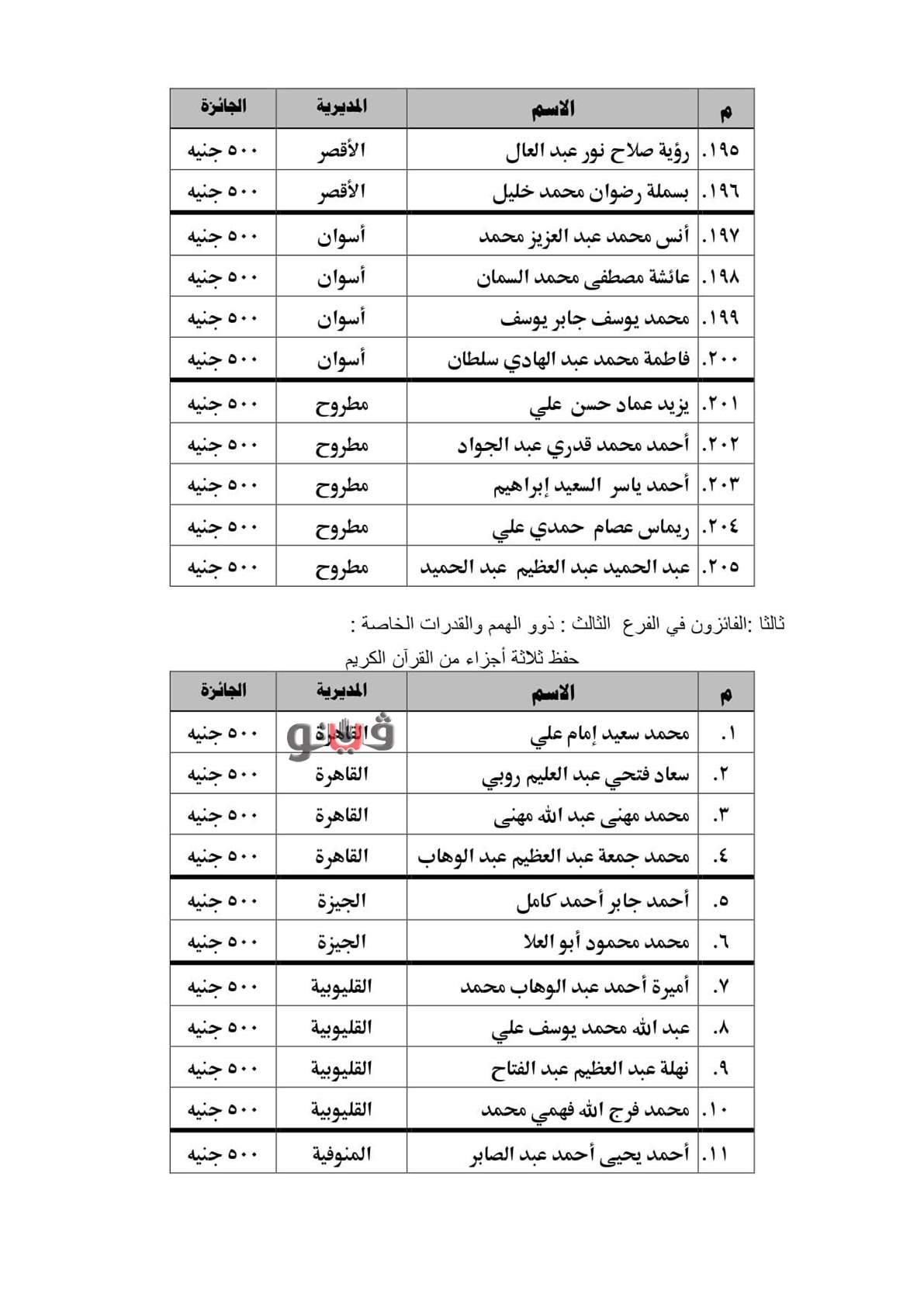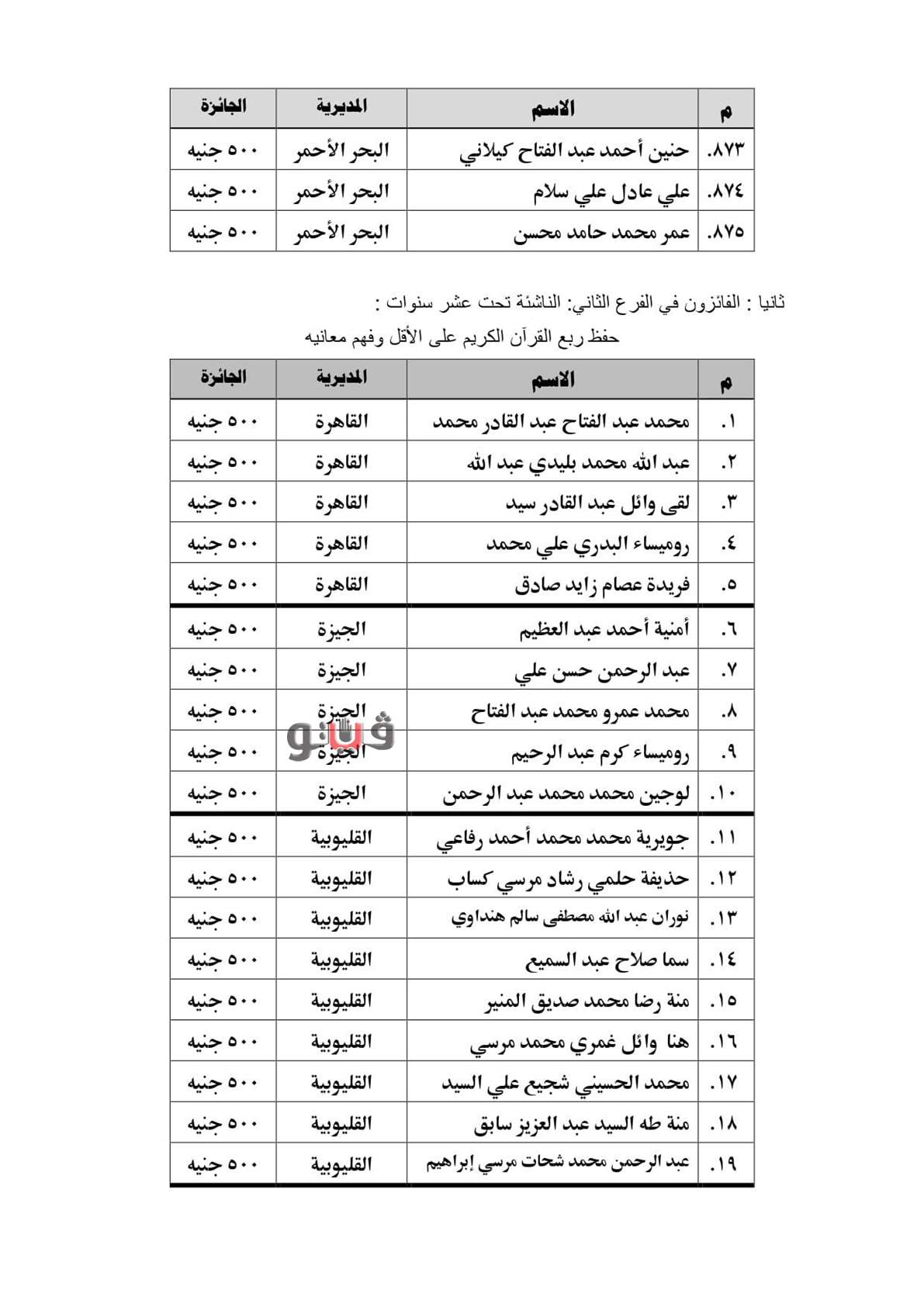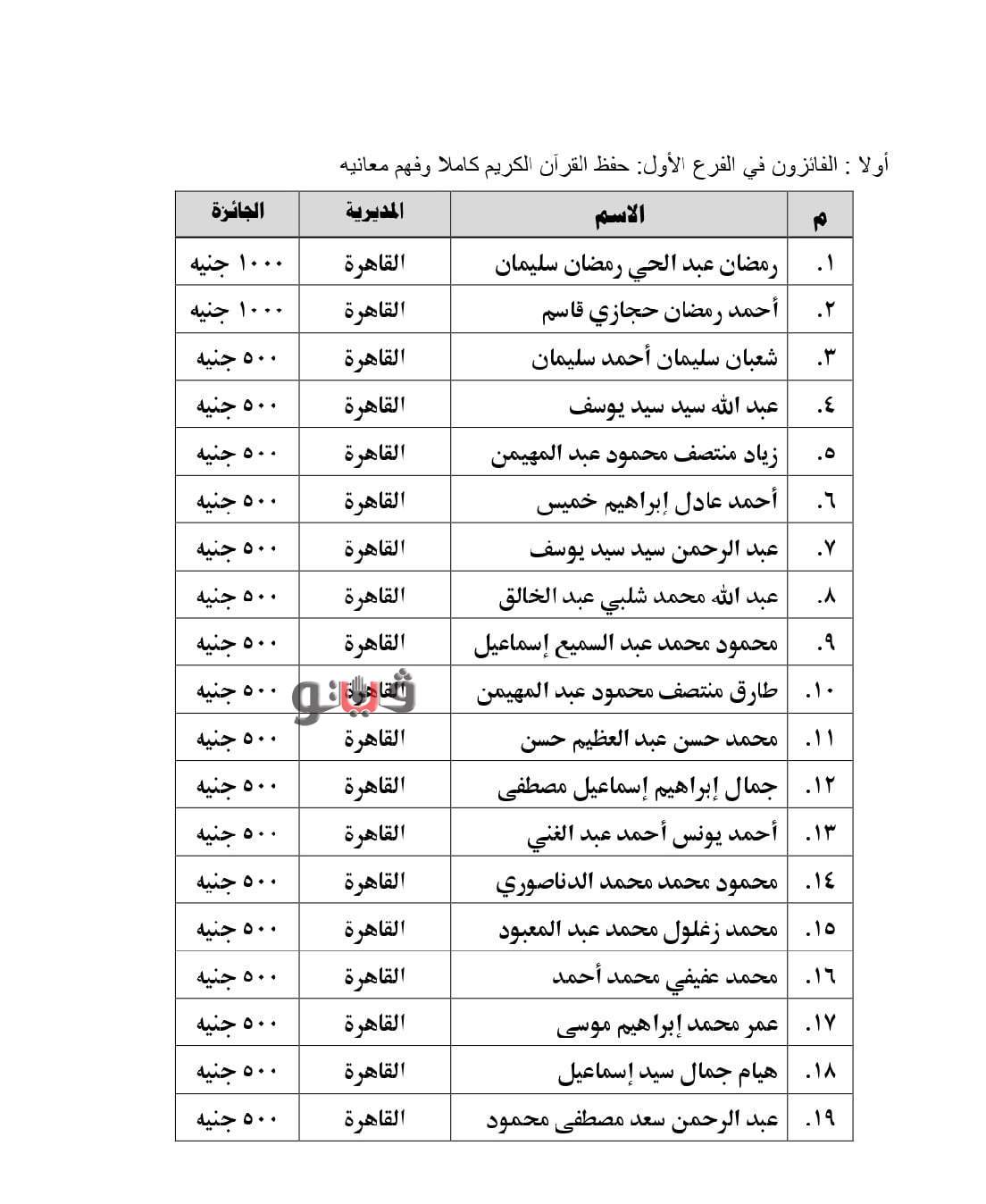 أعلنت وزارة الأوقاف عن أسماء الفائزين في مسابقة الأوقاف الرمضانية للقرآن الكريم وذلك خلال التصفية الأولية بالمديريات الإقليمية والجوائز الأولية لمسابقة الأوقاف الرمضانية للقرآن الكريم، وذلك على النحو التالي: