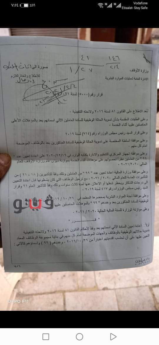 حصلت "فيتو" على الدفعة الأولى من تسويات العاملين في وزارة الأوقاف وعددهم 99 عاملا، وتسوية أوضاعهم الوظيفية.