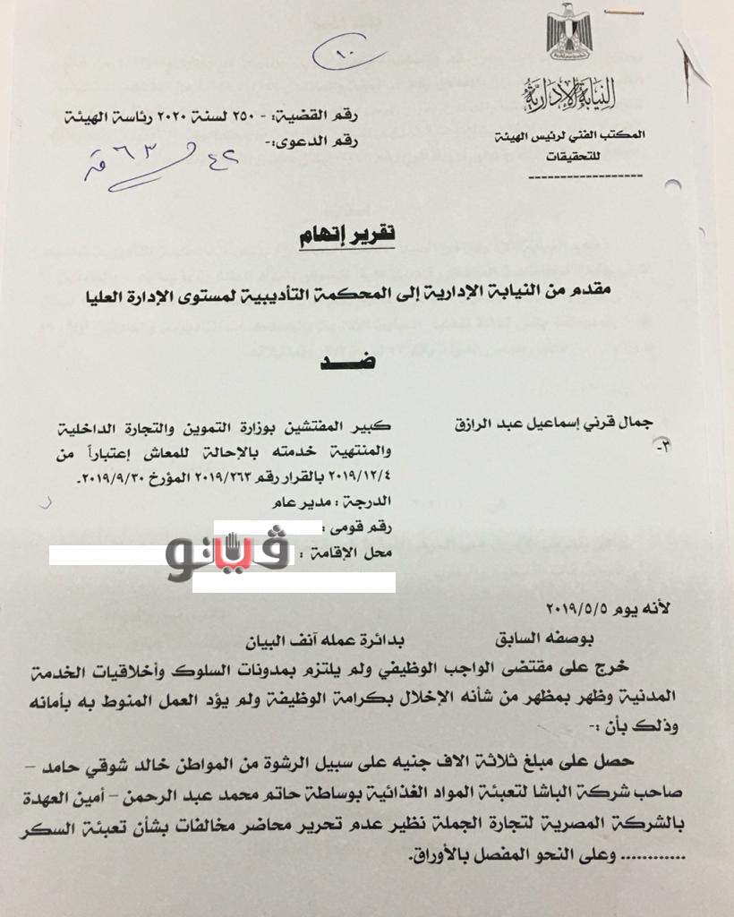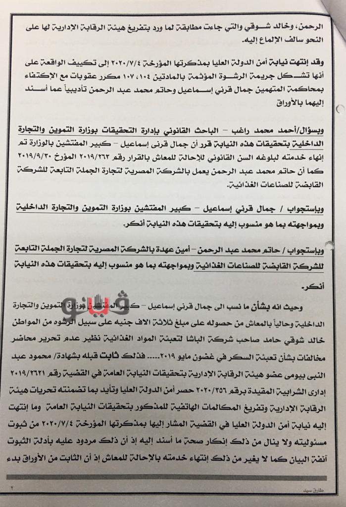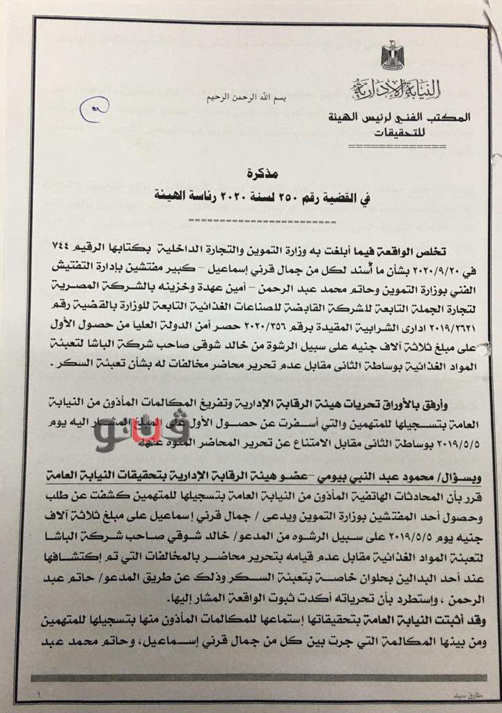 وأكدت النيابة الإدارية في تقرير الاتهام أن جمال قرني إسماعيل، كبير مفتشين بإدارة التفتيش الفني بوزارة التموين تقاضى قبل إحالته للمعاش مبالغ مالية على سبيل الرشوة من خالد شوقى صاحب شركة الباشا لتعبئة المواد الغذائية بوساطة حاتم محمد عبد الرحمن، أمين عهدة وخزينة بالشركة المصرية لتجارة الجملة التابعة للشركة القابضة للصناعات الغذائية التابعة لوزارة التموين مقابل عدم تحرير محاضر مخالفات له بشأن تعبئة السكر وفقًا لما جاء في القضية رقم ٢٦٢١ لسنة ٢٠١٩ إداري الشرابية المقيدة برقم ٢٥٦ لسنة ٢٠٢٠ حصر أمن الدولة العليا