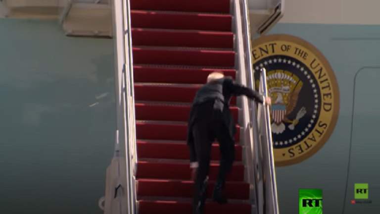 وإثر ذلك نهض بايدن بشكل سريع وصعد الدرج قبل أن يلقي التحية ويدخل إلى الطائرة.