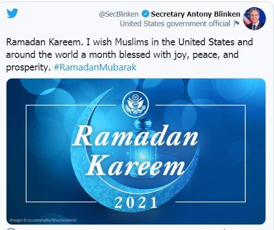 كما أعرب وزير الخارجية الأمريكي أنتوني بلينكن بالمناسبة في تغريدة عبر "تويتر" عن تمنيه للمسلمين في الولايات المتحدة وأنحاء العالم بأن يكون شهر رمضان شهرًا ينعم بالفرح والسلام والازدهار.