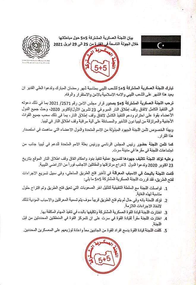 وشدد البيان على ضرورة تكثيف الجهود لتنفيذ أحكام اتفاق وقف اطلاق النار في ليبيا، كاشفا عن وجود اقتراحات لتذليل الصعوبات التي تعيق فتح الطريق الساحلي ، مهددا بالإعلان عن معرقلي فتح الطريق الساحلي في حال لم يتم فتحه قريبا.