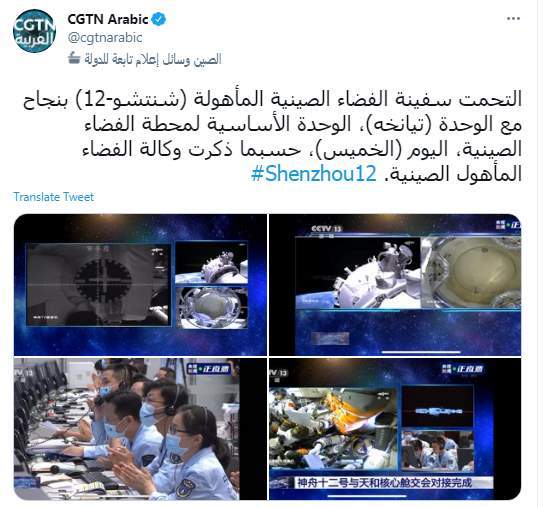 وكتب تليفزيون الصين "CGTN Arabic" عبر تويتر: "التحمت سفينة الفضاء الصينية المأهولة (شنتشو-12) بنجاح مع الوحدة (تيانخه)، الوحدة الأساسية لمحطة الفضاء الصينية، اليوم (الخميس)، حسبما ذكرت وكالة الفضاء المأهول الصينية. #Shenzhou12"