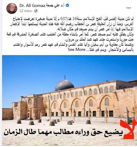 وكتب علي جمعة تدوينة على الفيس بوك "لم تكن مدينة القدس قبل الفتح الإسلامي سنة16 هـ/637 م إلا مدينة صغيرة تعرضت لاجتياح الفرس، ومنذ أن زار الخليفة عمر بن الخطاب رضي الله عنه هذه المدينة ليستلمها ابتدأ الإعمار الإسلامي فيها; إذ أمر عمر أن يبني مسجد في مكان صلاته"