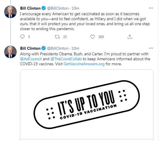 وكتب بيل كلينتون تغريدة على تويتر "أنا فخور بالشراكة مع الرؤساء أوباما وبوش وكارتر، ومع AdCouncil والصحة العامة الأمريكية لإبقاء الأمريكيين على اطلاع على لقاحات COVID-19"