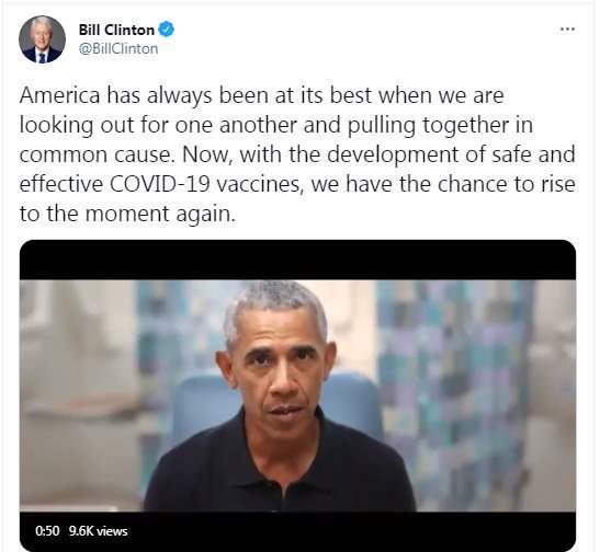 بث الرئيس الأمريكي السابق بيل كلينتون فيديو، عبر حسابه الرسمي بتويتر، لتشجيع الأمريكان وحثهم على التطعيم باللقاح ضد فيروس كورونا، حيث شاركه الحملة ثلاثة من رؤساء أمريكا السابقين باراك أوباما وجورج دبليو بوش، مؤكدين على أهمية التطعيم للأمريكيين جميعًا لتجاوز أزمة فيروس كورونا.