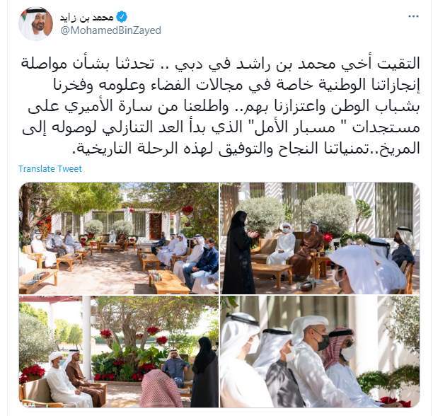وكتب الشيخ محمد بن زايد تغريدة على تويتر قال فيها: "التقيت أخي محمد بن راشد في دبي .. تحدثنا بشأن مواصلة إنجازاتنا الوطنية خاصة في مجالات الفضاء وعلومه وفخرنا بشباب الوطن واعتزازنا بهم.. واطلعنا من سارة الأميري على مستجدات " مسبار الأمل" الذي بدأ العد التنازلي لوصوله إلى المريخ.. تمنياتنا النجاح والتوفيق لهذه الرحلة التاريخية" .