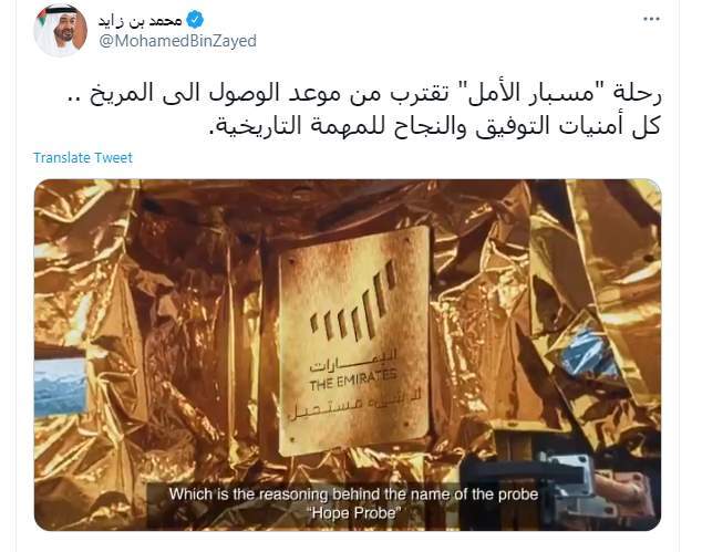 وقال "رحلة "مسبار الأمل" تقترب من موعد الوصول الى المريخ .. كل أمنيات التوفيق والنجاح للمهمة التاريخية".