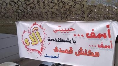 شهدشارع الجمهورية بمدينة المنصورة بمنطقةكوبري المدير في المشاية السفلية تعليق شابلافتة اعتذار إلى حبيبته.