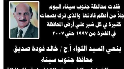 محافظ جنوب سيناء ينعي اللواء مصطفي عفيفي محافظ جنوب سيناء الأسبق ويقيم عزاء يوم الاربعاء القادم