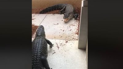 ظهر تمساحان عند الباب الأمامي لمنزل في مدينة فورت مايرز ولاية فلوريدا الأمريكية وفاجآ أصحابه بمعركة جبابرة.و