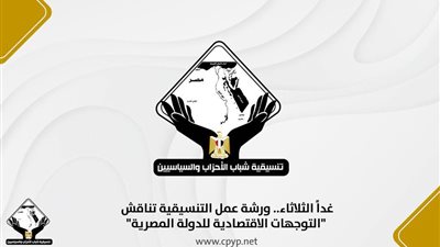 عقد تنسيقية شباب الأحزاب والسياسيين، ورشة عمل تحت عنوان التوجهات الاقتصادية للدولة المصرية.. طموح وتحديات ، وذلك اليوم في تمام الساعة الخامسة مساء ً.