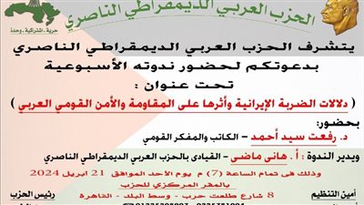 يعقد الحزب العربى الناصرى ،اليوم الاحد الموافق 21،4،2024 فى تمام السابعة مساءا بالمقر المركزى ندوتة الاسبوعية تحت عنوان دلالات الضربة الايرانية واثرها على المقاومة والامن القومى العربى