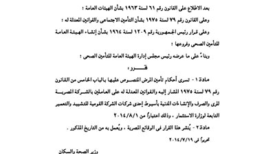 أصدرت وزارة الصحة والسكان قرارًا، بتطبق أحكام تأمين المرض المنصوص عليها بالباب الخامس من القانون 79 لسنة 1975 وتعديلاته، على العاملين بالشركة المصرية للرى والصرف والإنشاءات المدنية بأسيوط إحدى شركات ...