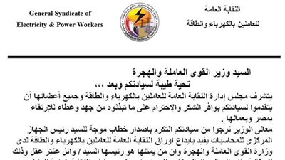 أرسلت النقابة العامة للعاملين بالكهرباء والطاقة خطابا إلى كمال أبو عيطة، وزير القوى العاملة، تطالبه فيه بإصدار خطاب موجه للمستشار هشام جنينة، رئيس الجهاز المركزي للمحاسبات، يفيد بإيداع أوراق النقابة ...