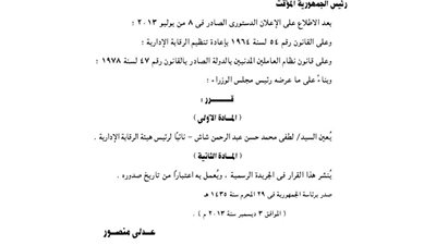 وافق الدكتور حازم الببلاوي، رئيس مجلس الوزراء، على مشروع قانون بتعديل أحكام القانون رقم 54 لسنة 1964 بإعادة تنظيم الرقابة الإدارية. ويتضمن مشروع القانون التعديلات التي تستهدف التأكيد على استقلال هيئة ...