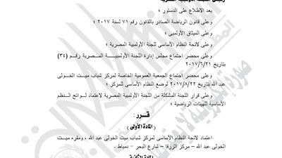 نشرت جريدة "الوقائع المصرية" في عددها رقم 223 تابع (ج)، الصادر في 4 أكتوبر 2017، قرار اللجنة الأوليمبية رقم 274 لسنة 2017، باعتماد لائحة النظام الأساسي لمركز شباب ميت الخولي عبدالله، ومقره ميت الخولي ...